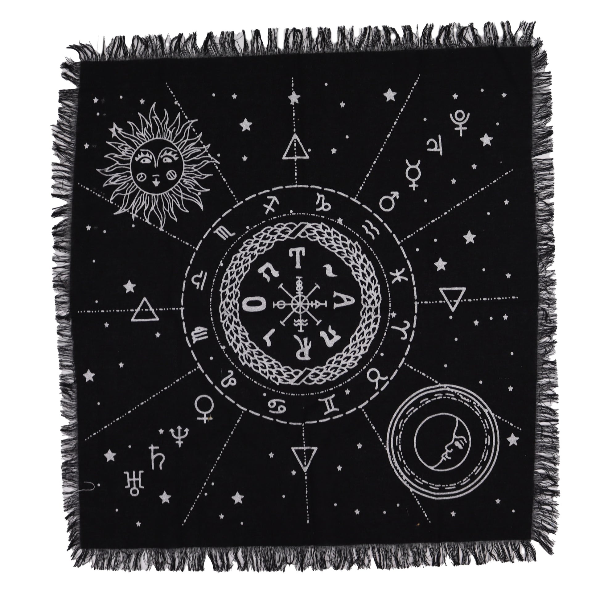 Dieses detailreiche Altartuch vereint Sonne, Mond und astrologische Symbole in einem faszinierenden Design. Ideal als Unterlage für Tarotkarten, Runen oder Pendelarbeiten – oder einfach als dekorativer Akzent im Wohnraum. Die klare schwarz-weiße Gestaltung mit Fransenrand macht es zu einem stilvollen Begleiter für jede spirituelle Praxis.