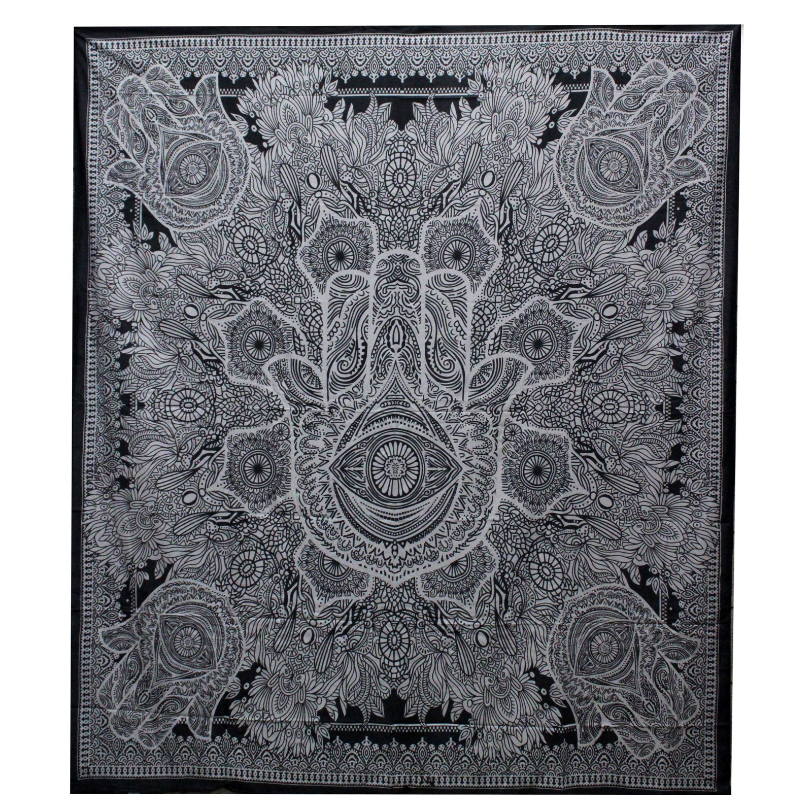 Verleihe deinem Raum spirituelle Kraft und ästhetische Eleganz mit dieser handbedruckten Tagesdecke/Wandbehang. Das detailreiche Hamsa-Motiv in Schwarz-Weiß symbolisiert Schutz, Glück und positive Energie – ideal für dein Wohnzimmer, Schlafzimmer oder Meditationsbereich.